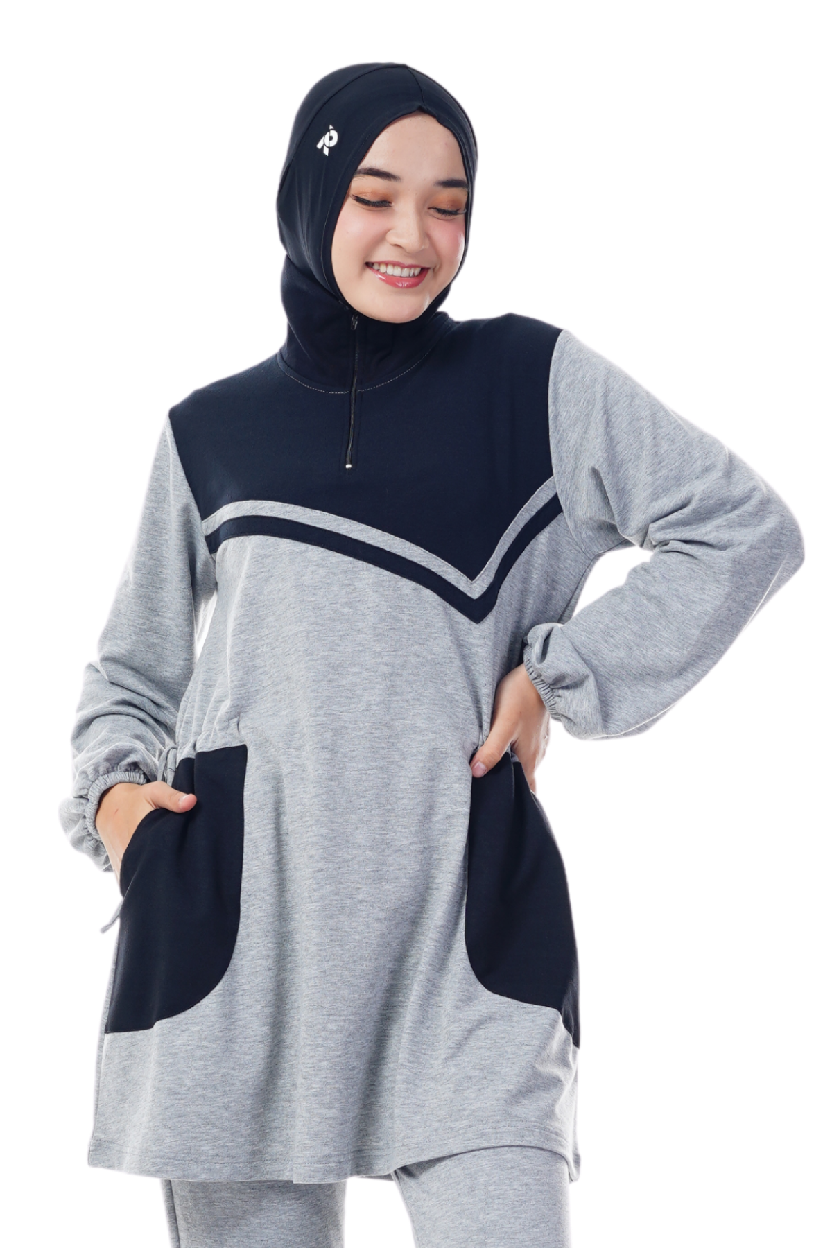 > Resleting dari leher sampai bahu yang bisa disesuaikan, Sebagai bukaan depan.