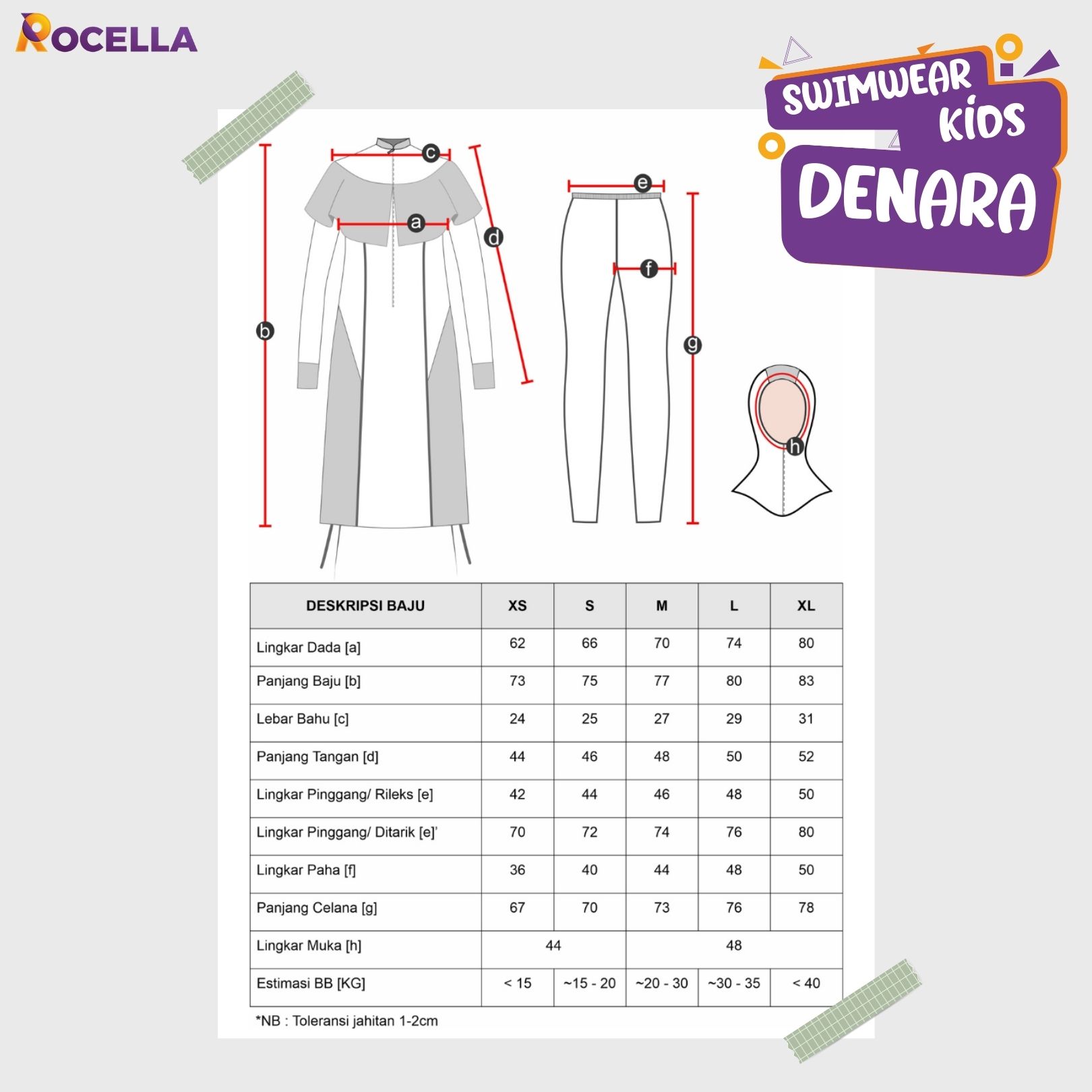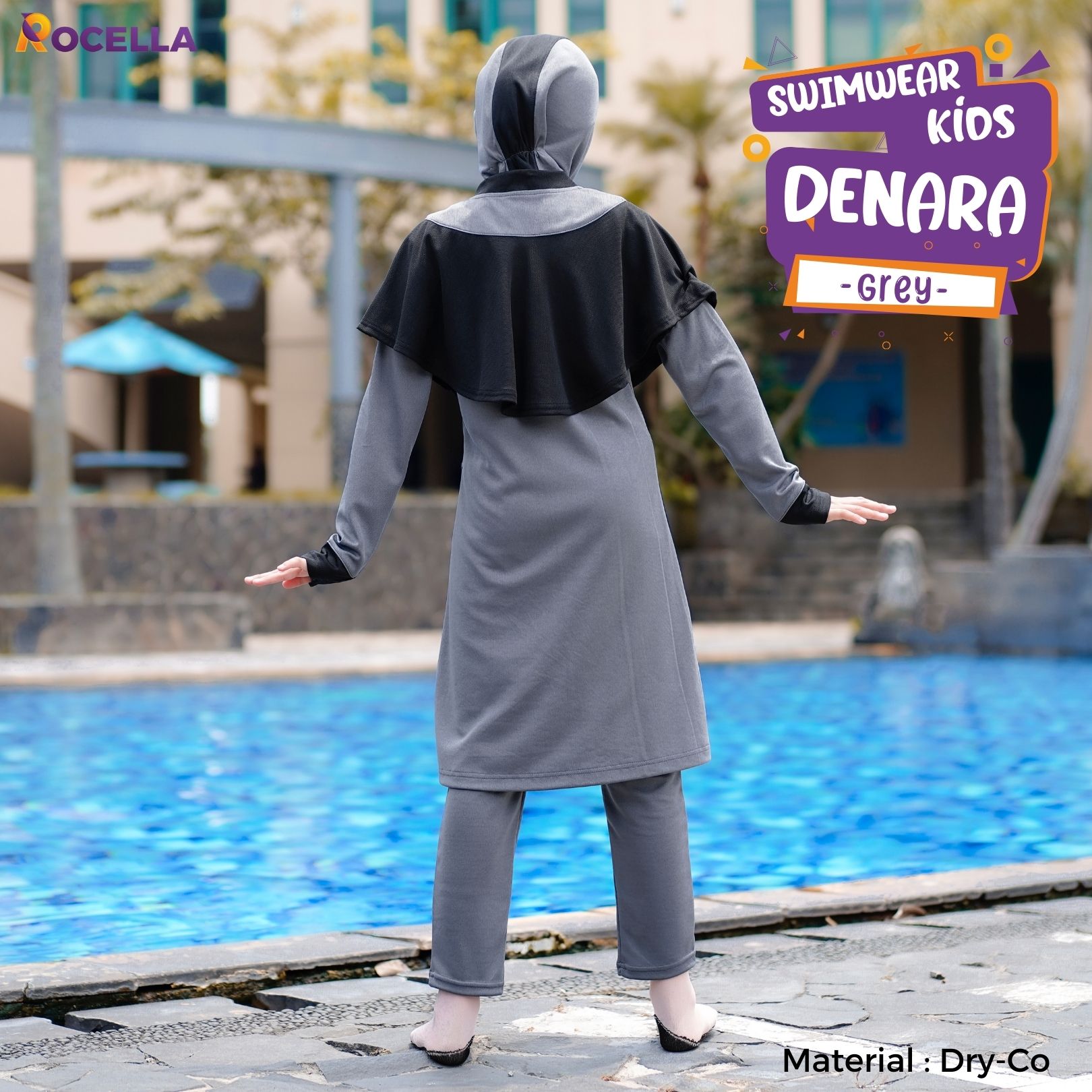 Swimwear Denara adalah Setelan renang anak Muslimah dengan design simple dan girly, dengan potongan sabrina yang menutup bagian dada dan disertai dengan tali pengikat dibagian dalam sehingga aman pada saat berenang. Terdiri dari 3 bagian: Kaos, Celana Legging dan Hijab. Berbahan dasar Dry-co yang terdiri dari campuran polyester, spandex dan nilon yang memiliki sifat elastis, padat, mudah kering dan nyaman digunakan untuk aktivitas renang buah hati bunda. Memiliki variasi warna Maroon, Electric Blue, Black dan Grey