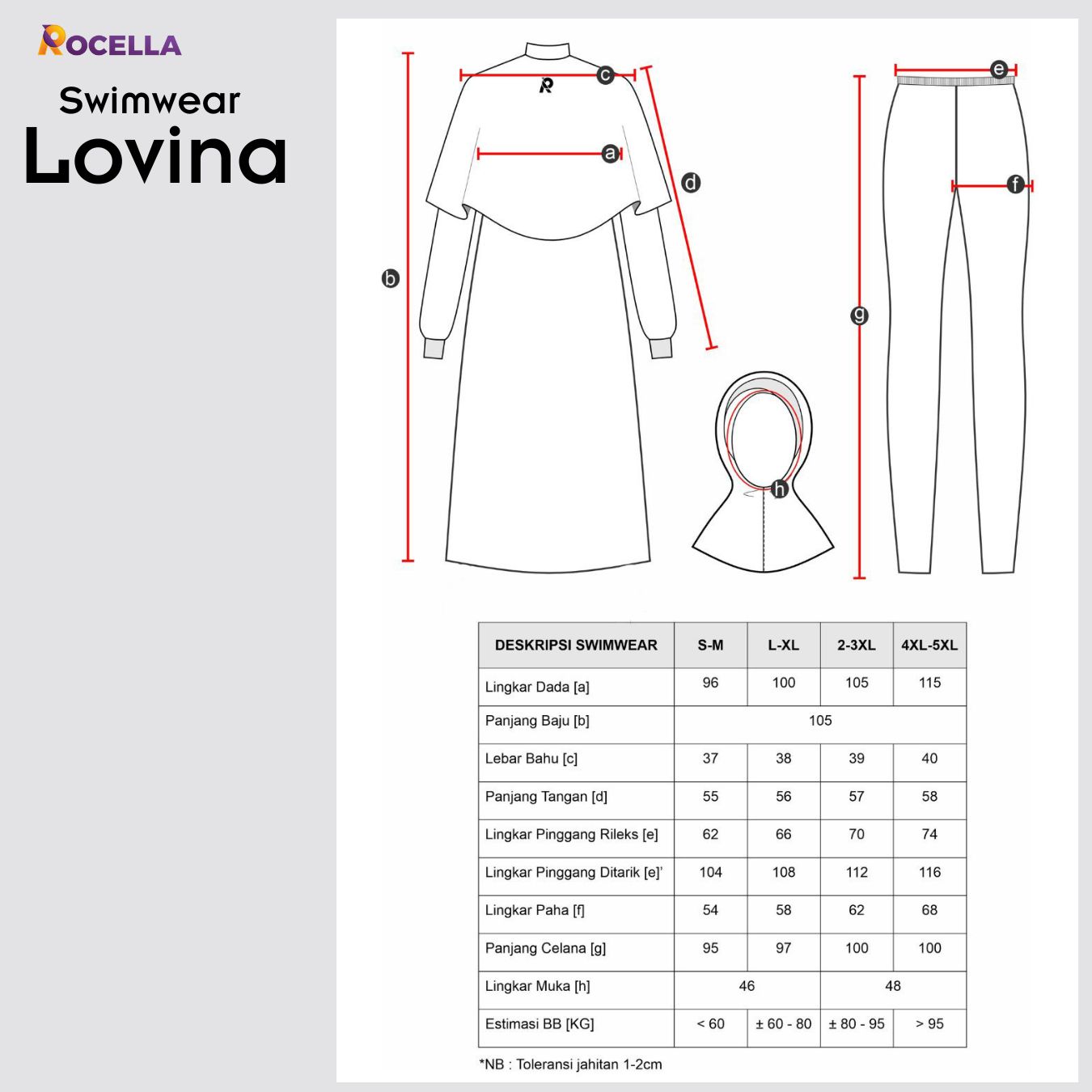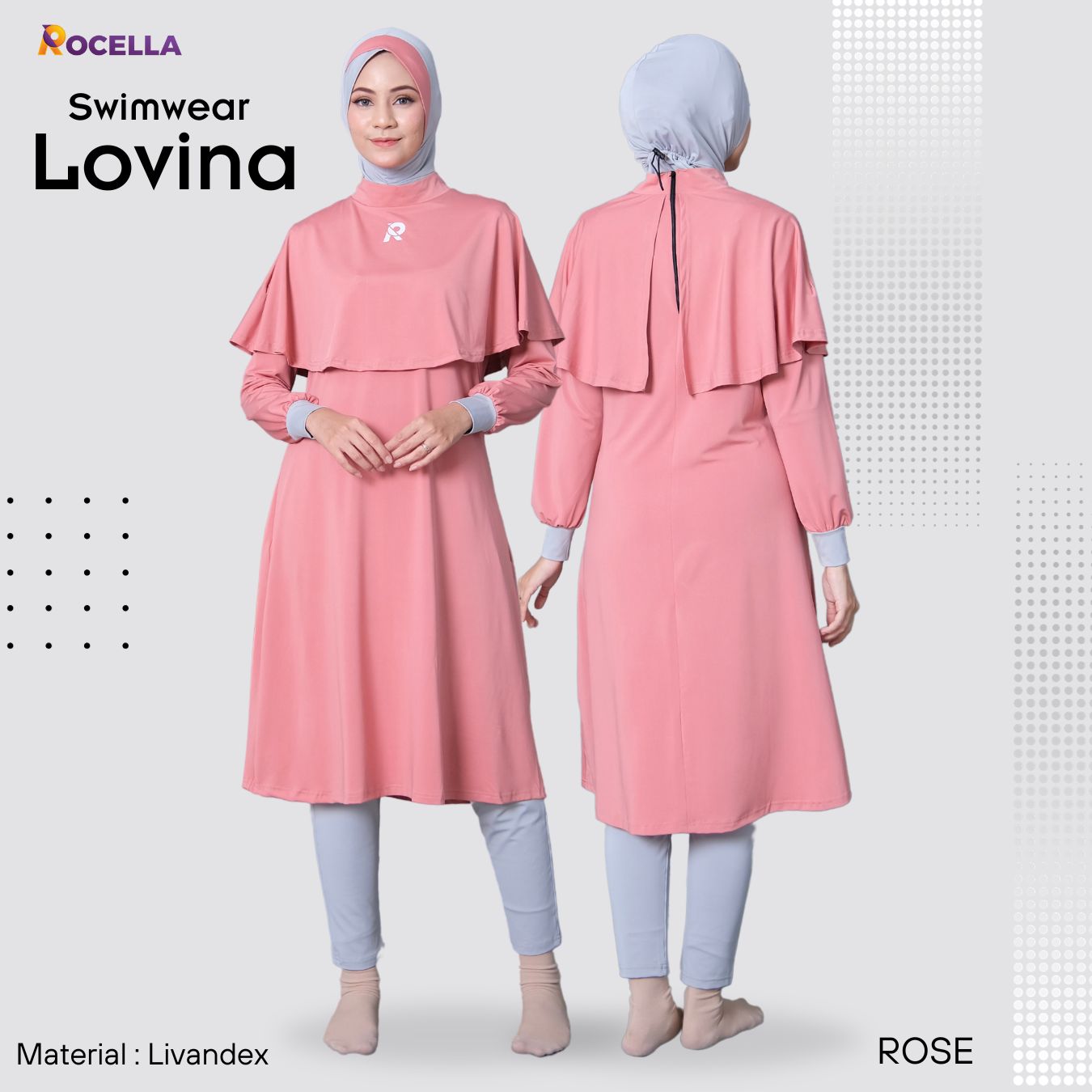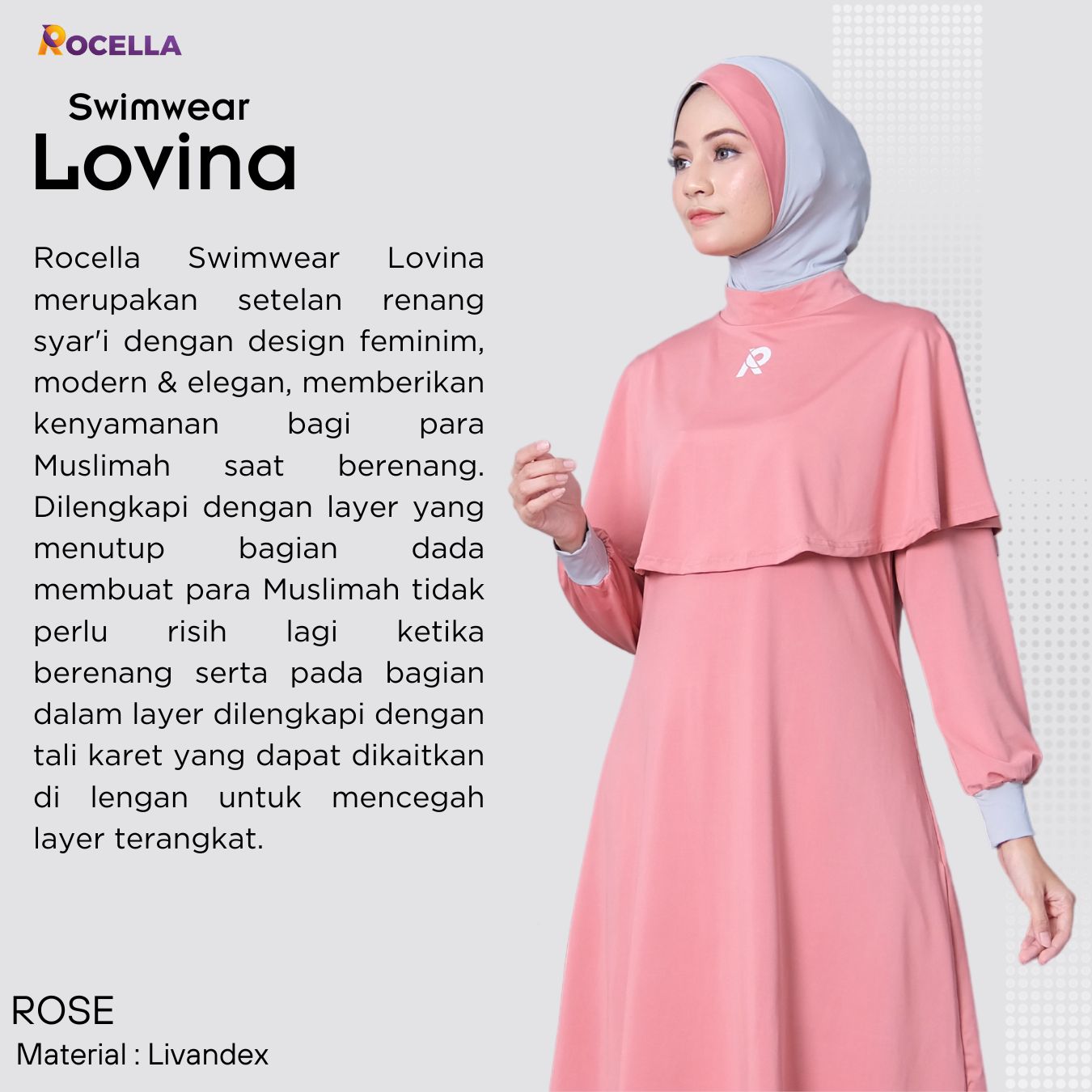 Rocella Swimwear Lovina merupakan setelan renang syar’i dengan design feminim, modern & elegan, memberikan kenyamanan bagi para Muslimah saat berenang. Dilengkapi dengan layer yang menutup bagian dada membuat para Muslimah tidak perlu risih lagi ketika berenang serta pada bagian dalam layer dilengkapi dengan tali karet yang dapat dikaitkan di lengan untuk mencegah layer terangkat. Berbahan dasar Livandex paduan dari spandek dan nylon, yang bersifat elastis, ringan, lebih cepat kering dan memiliki daya peregangan yang baik. Rocella Swimwear Lovina merupakan setelan yang terdiri dari: hijab, baju renang dan celana renang.
