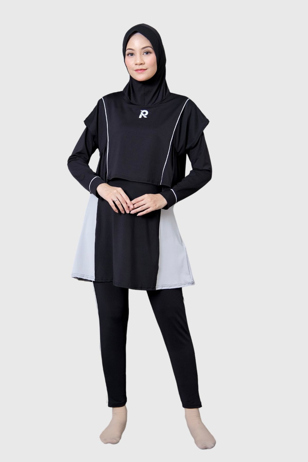 Rocella Swimwear Marbella merupakan setelan renang yang terdiri dari baju renang dengan hijab yang dijahit menyatu dan celana renang, dengan design yang feminim, modern dan elegan. Dilengkapi dengan outer yang menutup bagian dada dengan detail variasi lis kombinasi dan lipit di sisi kanan-kiri yang memberi kesan sporty namun tetap anggun, pada bagian dalam layer dilengkapi dengan tali pengait dan kancing untuk mencegah outer terangkat.